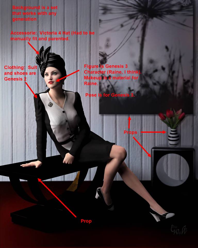 I’ve labeled the categories for each item used in this image. Note that the suit and shoes are for Genesis 2 on a Genesis 3 figure. They worked beautifully.