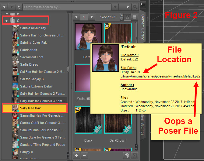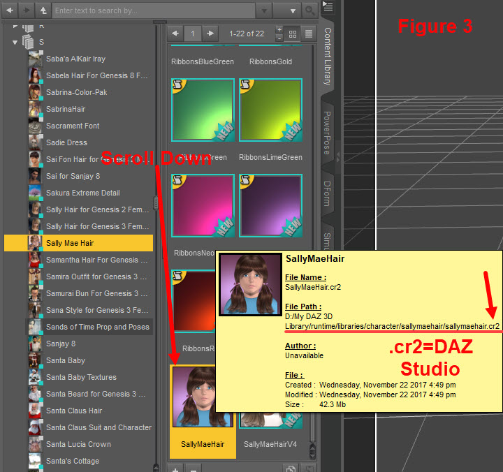 When I scrolled down to the bottom of the Sally Mae hair products, I found the DAZ Studio version for both Kids 4 and Victoria 4. The clue that it is a DAZ Studio version is the file type, .cr2. (See Figure 3)