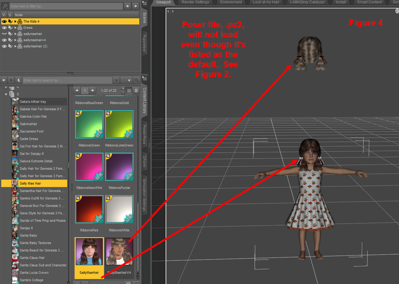 If I try to load the Poser version (.pz2) nothing happens. If I load the Victoria 4 version, the hair loads way above the Kid 4. If I load the .cr2 version, voila, it loads perfectly. (See Figure 4).